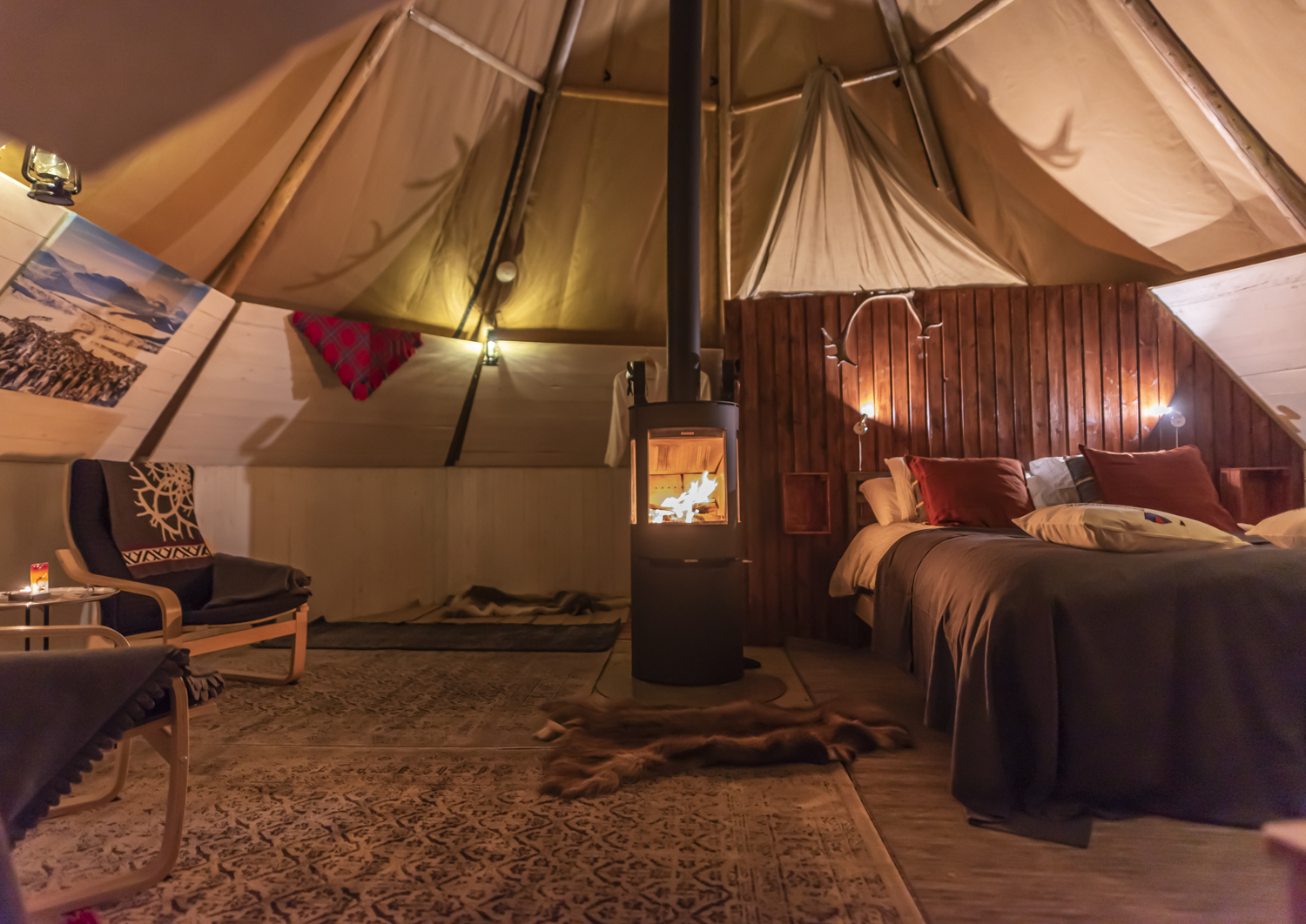 Lavvu Deluxe: The fireplace runs on wood during the day and evening. At night the fireplace will automatically switch over to pellet burning and keep a fire going throughout the night. There is also a fuel stove to provide additional heating in your Lavvu deluxe. During the night you hear a low, relaxing sound from the flame in the fireplace and a little automatic fan will help spread the warm air in the room.